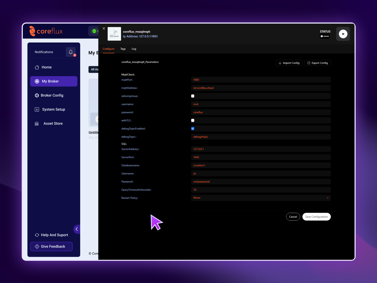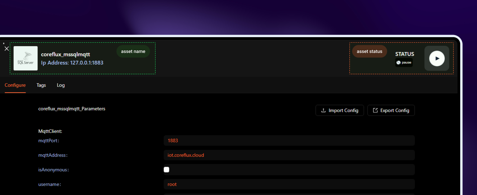coreflux_mssqlmqtt.json. Note that configurations uploaded this way are not automatically saved. - Export Config: This button enables you to download the current configuration of your connector in a JSON file format. It is important to remember that the export will reflect the last saved configuration in the broker. For example, if a field initially had the value A and you changed it to B but did not save this change, the exported file will still show the value A.
